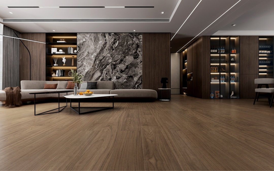 开阔视效: 纹理清晰,色泽温润。当它们以1/3错位铺或随机铺的方式在大空间中延伸,减少了拼缝的数量,如同为您的家铺上一块巨大的画布,极大地增强了空间的纵深感和连贯性,让原本有限的空间瞬间显得更为开阔。